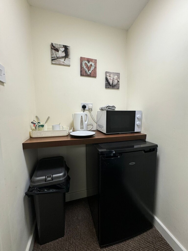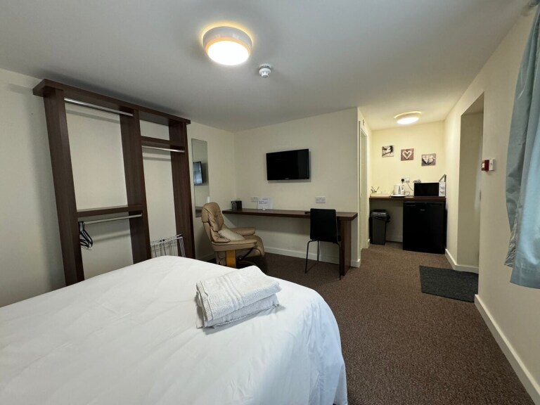 This inviting space features a cosy double bed, a wall-mounted TV, and a compact work area for convenience. Enjoy a handy tea and coffee station with a fridge and microwave for simple meals, along with Wi-Fi and a private en-suite shower. It provides an ideal base for work trips, weekend escapes, or exploring the vibrant Tees Valley.
