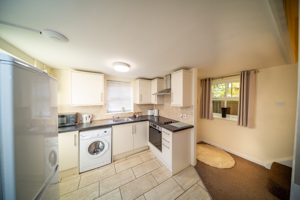 The open-plan living area downstairs features a large leather sofa and an additional armchair, perfect for relaxing after a day of sightseeing or business. A dining table provides space for shared meals, while a flat-screen TV and Wi-Fi ensure entertainment and connectivity. The well-equipped kitchen is suitable for both short breaks and longer stays, with a hob, oven, fridge freezer, and all necessary utensils for preparing meals. For added convenience, a washer/dryer is available to handle laundry needs during your visit.
